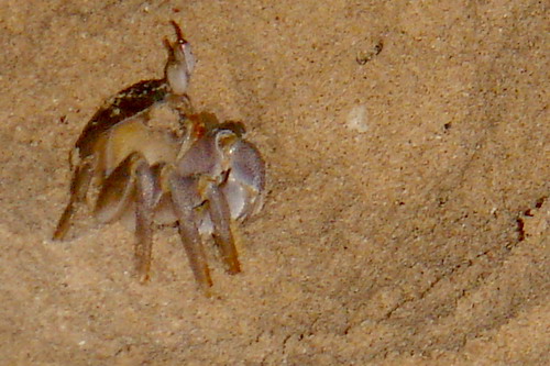 Personalmente ho sempre pensato che i granchi visti a Karpathos fossero entrati nel Meditteraneo dal Canale di Suez ed avessero quindi origine dal Mar Rosso e dall'Oceano Indiano come moltissime delle strane specie di vita marina che ho trovato in quell'isola. Effettivamente a vedere le vostre foto potrebbero benissimo essere gli stessi granchi! Un'altra cosa strana che ricordo è che di fronte a 30-40 buchi sulla spiaggia abbiamo visto solo 2 granchi di cui uno solo per un attimo ed invece un altro usciva spesso. Non penso che fosse per paura di noi umani in quanto eravamo in 4 persone in una spiaggia di 50-100 merti, e neanche il troppo caldo in quanto eravamo a metà ottobre, quanto piuttosto fossero granchi con prevalenti, anche se non esclusive, abitudini notturne.